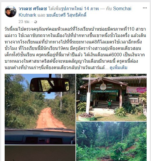 เมื่อวันที่ 15 พ.ย. 2560 ผู้ใช้เฟซบุ๊กคุณ วรเดช ศรีเดช ได้โพสต์เรื่องของครูสาวที่เสียสละไปสอนในพื้นที่ห่างไกล ไร้ความเจริญ ได้เงินเดือนน้อย แต่มีความตั้งใจ สอนเด็กให้มีความรู้ โดยคุณ วรเดช ศรีเดช กล่าวใว้ดังนี้